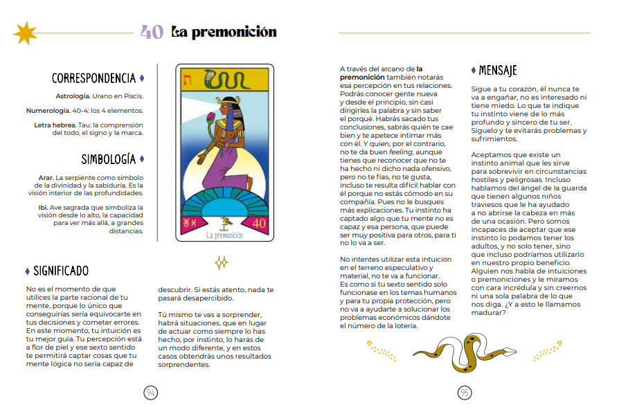 Pack completo para la adivinación y el oráculo que incluye un libro de interpretación del tarot egipcio con pautas de numerología, astrología y cábala y una baraja de 78 cartas para practicar. Un estudio completo del significado de cada carta para lecturas simples y otro de su relación con el resto de la baraja para lecturas complejas que transmite un mensaje milenario con el que alcanzar el crecimiento espiritual.