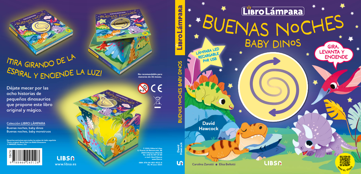 Déjate mecer por las historias de pequeños dinosaurios que proponen estos libros originales y mágicos. Son libros para dormir que te dejarán con la boca abierta. Al girar y levantar la solapa central de la tapa ¡tu habitación se iluminará al instante!. Dentro del libro encontrarás 8 dulces rimas para dar las buenas noches a los pequeños dinosaurio y a los jóvenes lectores.