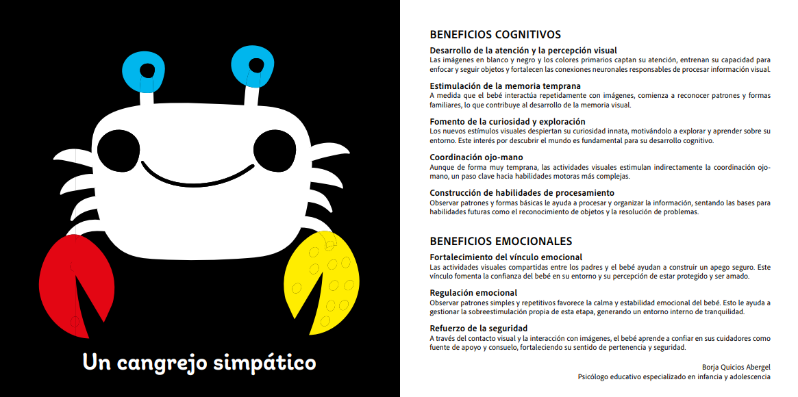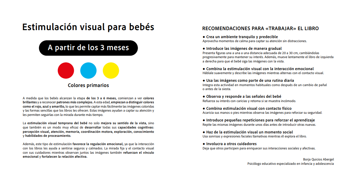 A partir de los tres meses de vida, el sentido de la vista del bebé evoluciona y, además de distinguir el blanco y negro, ya es capaz de percibir los colores primarios rojo, amarillo y azul. Esta práctica tiene múltiples beneficios, como localizar la atención, fortalecer su memoria, fomentar su curiosidad, mejorar su coordinación, ayudar al procesamiento de información y fortalecer el vínculo entre el bebé y sus progenitores.