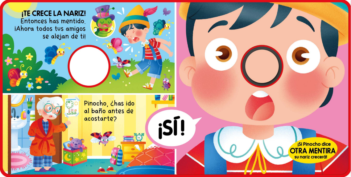 Un librito para aprender a portarse muy bien y a no decir nunca mentiras de un modo muy gráfico… ¡Porque es un libro que crece! Al pasar las páginas, el troquel interior permite que la nariz de Pinocho se vaya asomando hasta sobresalir por completo al final del libro sin ningún peligro para los más pequeños, ya que están hechos de blanda goma Eva o foam.
