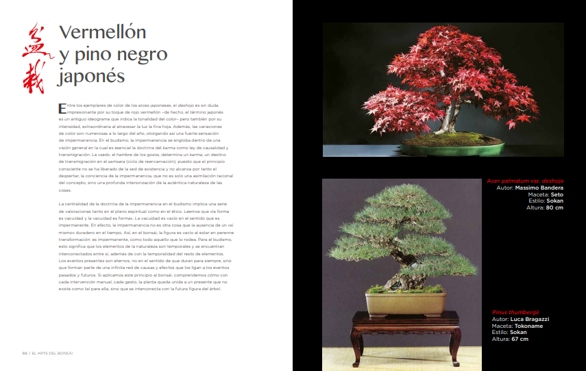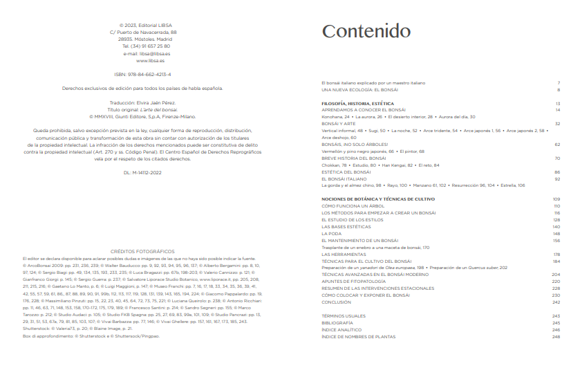 Es un libro precioso, que ilustra el origen y la evolución, la filosofía y las reglas estéticas que subyacen en esta maravillosa forma de arte natural. Pero también es una guía práctica indispensable para las técnicas de diseño, montaje y mantenimiento y cuidado diario del bonsái. Los textos, didácticamente innovadores, están respaldados por más de 230 fotografías y dibujos.