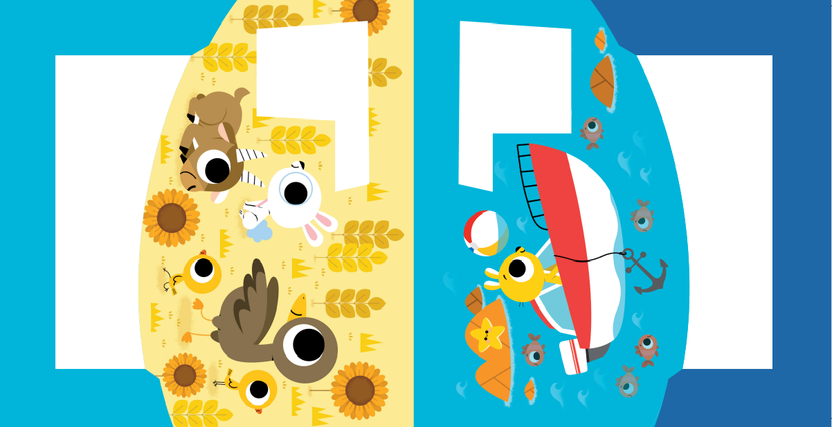 Nunca has visto una colección como esta: ¡son dos libros reversibles! Empieza a leer por un lado y cuando llegues al final, dale la vuelta y empieza a leer de nuevo en sentido contrario. Cada página de cartón tiene preciosos animalitos troquelados con los que descubrir los transportes aprendiendo el doble: una vez al ir y otra al volver.