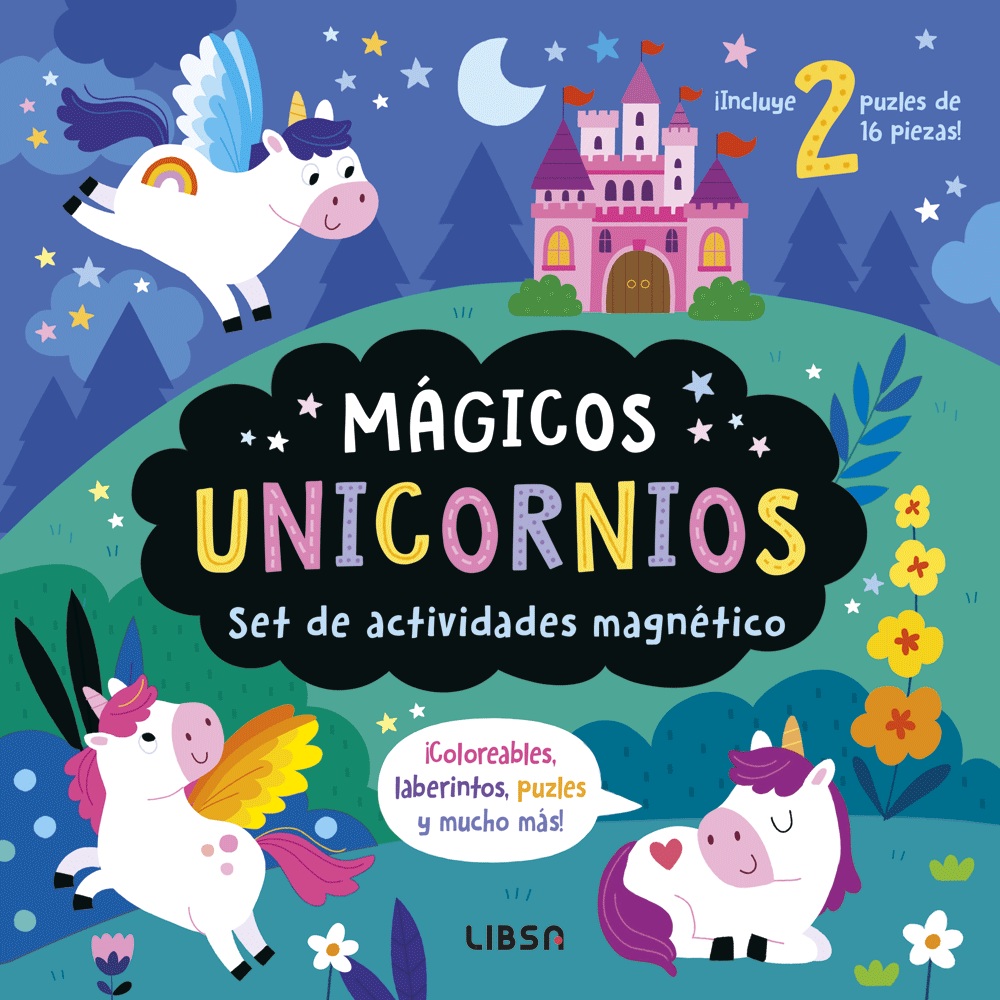 Presentamos un pequeño mundo para explorar a fondo: los unicornios, en un estuche que reúne un librito de actividades para colorear, resolver laberintos, hacer juegos de atención, unir puntos o sopas de letras y, de regalo, dos preciosos puzles magnéticos para aprender pieza a pieza.