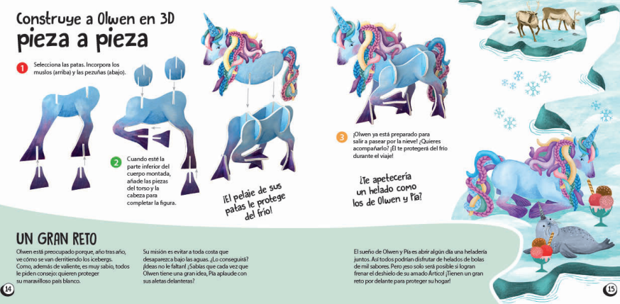 ¿Te gustaría descubrir el mundo de los unicornios? En esta caja encontrarás un libro para saber más sobre sus hábitats y costumbres y piezas para construir 6 unicornios muy especiales, Cordelia, Aisha, Olwen, Okalani, Kin y Miray.
